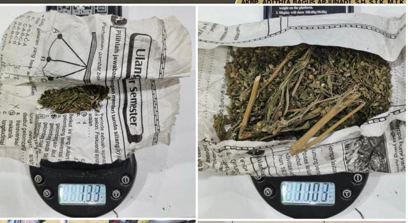 Saat dilakukan penggeledahan badan, petugas berhasil menemukan barang bukti narkotika golongan I jenis ganja yang disimpan pelaku di dua tempat berbeda. Di kantong celana bagian belakang sebelah kiri, ditemukan satu bungkus kertas koran berisi irisan daun dan batang ganja dengan berat bruto 11,03 gram.